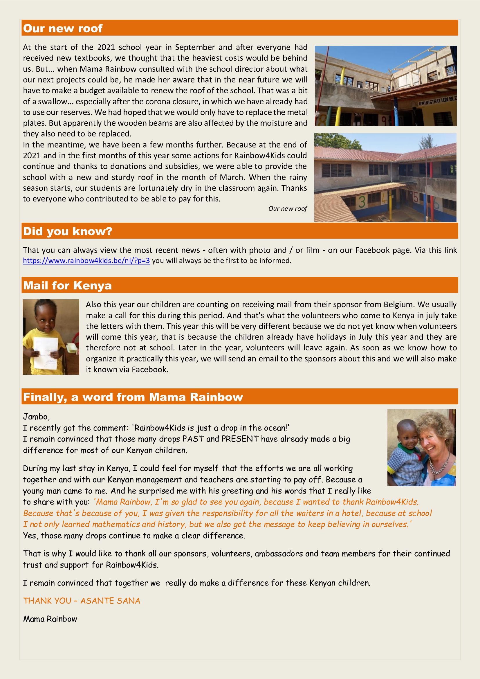 Since the start of the 'Rainbow4Kids' project, we have kept our sponsors and sympathizers informed about our project by sending them a newsletter at irregular times with always many photos. Because 1 photo says more than 1000 words, they say.